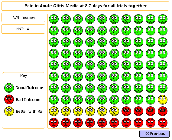 Chris Cates has updated his excellent "NNT" digrams for the management of acute otitis media. He's got these cool charts that help explain the concept of an NNT. I use these in the office .. pulling up his site on the internet and walking parents through these concepts. WHile 1st year medical students seem to have a problem with "NNT" -- mom and dad seem to "get it" without too much trouble.