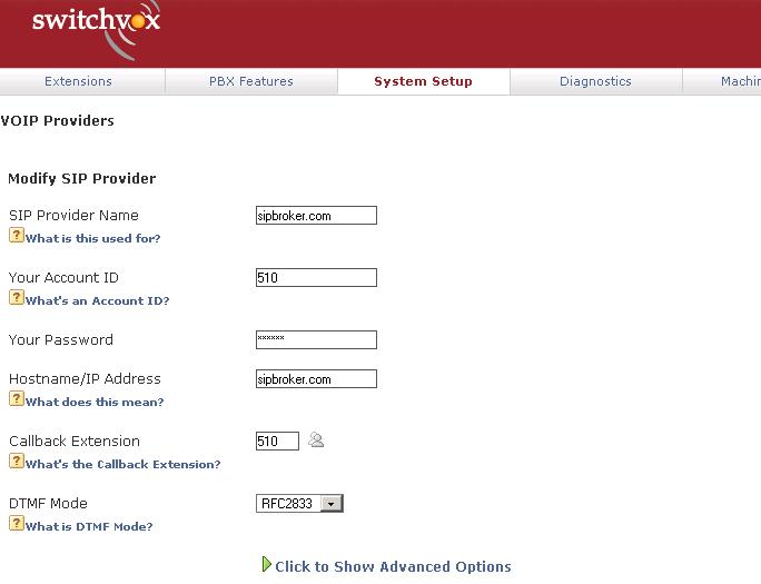 YOu need to set up a Switchvox extension that you are going to map the sipbroker account to. That way - calls from sipbroker will go directly to that extension in Switchvox. You can do this with a real extension - or a virtual one - that forwards to another extension (or even to your cellphone/home phone etc). If you’ve used Switchvox at all - you know how to do this. Very easy. The extension you set up will be the “callback extension” below.