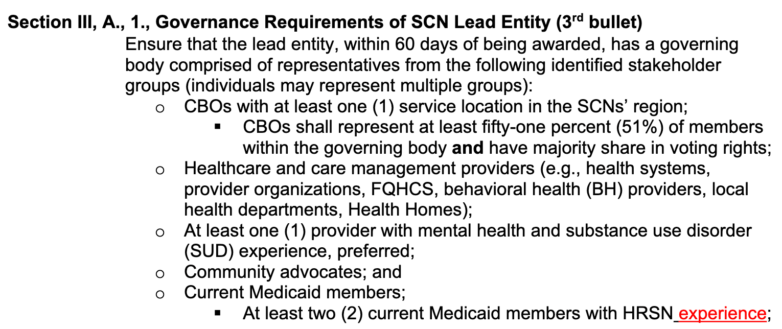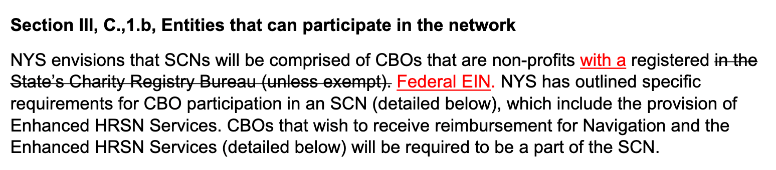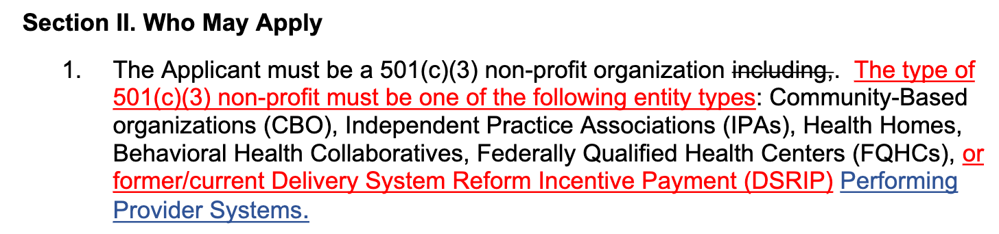 ![]() | I think this one just fixes a typo / forgotten word. I’ll take this opportunity to get on my soap box to reiterate the reality that this requirement is a big deal, and a very good policy decision that DOH made in the crafting of this RFA. More than 1/2 of the governance needs to be from CBOs. This would disqualify the vast majority of the DSRIP PPSs from the previous waiver, unless they play some sort of jujitsu by creating new daughter entities in (very) short order and have those entities do the application. The policy goal here is clear: take the control away from the incumbent (medical) enterprises that still generate the majority of their revenue from fee-for-service care and therefore have conflict of interest with the policy goals of the program - which is to invest upstream - thereby reducing the quantity of fee-for-service care - especially acute care. We saw (and felt) this all-too-often in DSRIP. It’s great to see that DOH is taking this seriously. DOH will be on the lookout for the jujitsu governance shenanigans and will disqualify applications that lack transparency of true CBO controlled governance. |