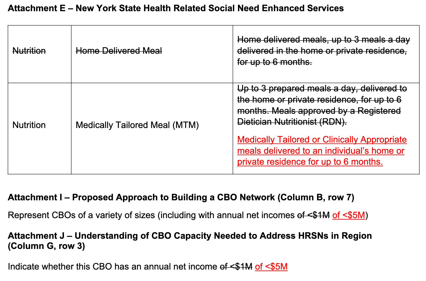 ![]() | a) Removing 3 meals a day without constraints. This may have been seen as a loophole too-big-to-retain, and may not have sufficient evidence to support trie ROI for the program with reduction in total cost of care. b) Specifying that MTM is expected and that there needs to be a clinical justification for such comprehensive food assistance. c) $1M as an upper threshold for CBOs would eliminate several of the effective CBOs such as Jewish Board in NYC and Catholic Charities upstate.  |