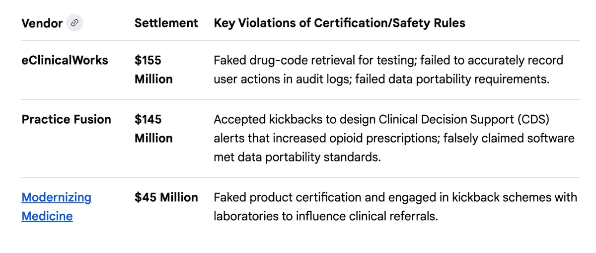 All of these parts are important: Health IT systems are now the backbone of how health care is administered in the United States. We have regulatory infrastructure for food, for medications, for transportation, and for water. The DOJ pursuit of companies that violated the regulations has sent a firm message: safety is important, and the certification requirements are important elements of preserving the safety of 330 million people.